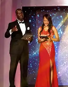 ![]() Joey Muthengi with Tusker Project Fame Co-host Dr. Mich (left) | |