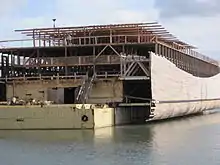 A few years earlier Huibers built a half-scale interpretation of the Ark, in the river port of Schagen, 50 km north of Amsterdam. Huibers did the work mostly with his own hands, using modern tools and occasional help from his son, in one and a half years. Its size, adapted for sailing the Dutch canals and locks, was 70 metres (230 ft) long, 9.5 metres (31 ft) wide, and 13 metres (43 ft) high.[3] The cost to build was 1 million euro.[1] In 2007 Huibers opened the doors to visitors. After a few months the vessel was towed by tugboat through the canals and moored in 21 harbors in the Netherlands. The ark was sold to Dutch artist Aad Peters in 2010. He tours through Germany, Denmark and Norway. Although the ark isn't really seaworthy and can't handle waves higher than two meters, it was successfully towed across the sea from Denmark to Norway.[4] On 10 June 2016, the ark collided with a moored vessel (NoCGV Nornen) while under tow in Oslo harbor. The ark suffered severe damage to its wooden cladding.[5]