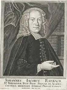Rambach was the son of Hans Jakob Rambach, a cabinet maker. For a time, he trained with his father, but then attended the University of Halle as a student of medicine, before becoming interested in theology.[1] In 1723 he was appointed as an adjunct of the theological faculty, and in 1927, after August Hermann Francke's death, a professor. After earning a Doctor of Divinity in 1731, he was appointed the first professor of theology at University of Giessen. He was offered a professorship at the University of Göttingen, but decided to remain in Giessen. He died of fever 1735.