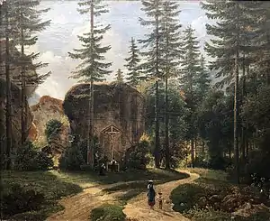 In 1803, he took his first painting excursion to Upper Austria and Salzburg. It was the first time he had seen such landscapes in person, rather than vicariously through the works of other artists. His desire to learn more was such that he went to Dresden solely to visit the Gemäldegalerie Alte Meister and copy two works each by Claude Lorrain and Jacob van Ruisdael.[2]