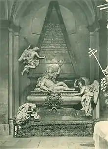 After Joseph's death on 17 April 1711 Wratislaw, as a minister, became a member of the council advising his widow as Regent, Eleonore-Magdalena, which brought about the withdrawal of Joseph's brother Karl from Catalonia. When Karl was crowned as Emperor Charles VI he confirmed Wratislaw in his offices, who remained from then on in Vienna, where, badly overweight, he was believed to have died on 21 December 1712 of dropsy. His remains were interred for a year in Vienna's Totenkapelle before being moved to the Bazilika svatého Jakuba Většího in Staré Město, Prague in 1714, following the completion of an elaborate sarcophagus by the famous Baroque architect Fischer von Erlach. [2]