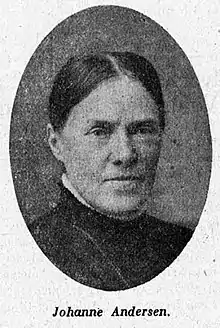 Johanne Kirstine Andersen née Christiansen (1862–1925) was a Danish women's rights activist. In 1908, she co-founded and subsequently headed the Balslev-Ejby branch of the Danish Women's Society in the north-west of the island of Funen. Two years later, she became a member of the national organization's joint management board, serving as deputy chair from 1919 until her retirement in 1922. She was particularly active in promoting the interests of women from rural communities and encouraging women's involvement in household planning and in running school canteens. Politically, after Danish women obtained voting rights in 1915, she joined the Venstre party but did not succeed in being elected to the Folketing in the 1918 elections.[1][2][3]
