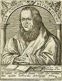 Johannes Schöner (16 January 1477, in Karlstadt am Main – 16 January 1547, in the Free Imperial City of Nuremberg) (aka, Johann Schönner, Johann Schoener, Jean Schönner, Joan Schoenerus) was a renowned and respected German polymath. It is best to refer to him using the usual 16th-century Latin term "mathematicus", as the areas of study to which he devoted his life were very different from those now considered to be the domain of the mathematician. He was a priest, astronomer, astrologer, geographer, cosmographer, cartographer, mathematician, globe and scientific instrument maker and editor and publisher of scientific tests. In his own time he enjoyed a Europe-wide reputation as an innovative and influential globe maker and cosmographer and as one of the continent's leading and most authoritative astrologers.[1] Today he is remembered as an influential pioneer in the history of globe making, and as a man who played a significant role in the events that led up to the publishing of Copernicus's De revolutionibus orbium coelestium in Nürnberg in 1543.