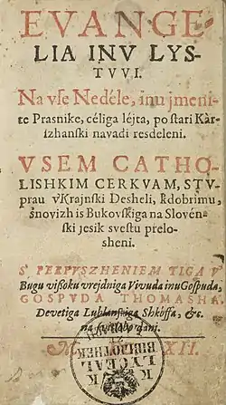 The most important religious figure of this era in Slovenian territory was the bishop of Ljubljana, Thomas Chrön. As bishop, he participated in destroying Protestant publications, razing their churches, and expelling Protestants, as well as having their corpses exhumed. Chrön was unable to realize his plan to publish a catechism, a prayer book, and a hymnal, and to establish a press, but he did succeed in having 3,000 copies of the book Evangelia inu lystuvi (Gospels and Epistles) published at his expense in Graz in 1613. This was based on Jurij Dalmatin's Bible translation, but with expressions of foreign origin replaced with Slovene expressions. The work continued the Protestant linguistic heritage in Slovenian territory, and it was later reprinted eight times, always using the language of the Protestant text. In 1615, a Slovene translation of Peter Canisius's Catechismus minor was published in Augsburg (titled Catechiſmus Petri Caniſij Soc. Iesv Th. Skusi malane Figure napréj poſtavlen 'The Little Catechism of Peter Canisius SJ Presented with Illustrations').[3] Both of these publications were prepared by Tschandek. Tschandek was one of the first Slovenian Catholic writers to write books in Slovene for Slovene priests.[1]