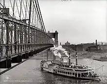 ![]() A view of the John A. Roebling Suspension Bridge from Cincinnati, Ohio on the north bank of the Ohio River with Covington, Kentucky in the background | |
