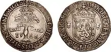 On 10 July 1567 Mary's opponents, the Confederate lords, ordered her servant Servais de Condé to surrender silverware in his keeping for coining to Acheson. This included a silver gilt nef or ship for the queen's table.[13] In August 1567 Regent Moray ordered Acheson was ordered to coin a "James Ryall", depicting a crowned sword with the motto "Pro Me Si Merior in Me" and on the other side the royal arms with crowned letters "JR" for James VI, and the legend "Jacobus 6 Dei Gra Rex Scotorum."[14]