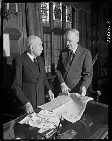 ![]() Lt.Col. J.B. Maclean (left) and Horace Hunter with a copy of The Financial Post, 1947 | |