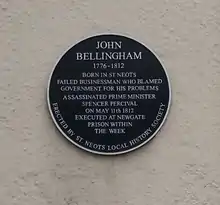 In September 2009, the St Neots Local History Society erected a plaque on Bellingham House in St Neots. The house, on the corner of Huntingdon Street and Cambridge Street, is said to be the birthplace of Bellingham.[6]