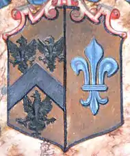 - 8th: Azure, two bars between nine martlets argent, 3,3,2,1 (shown here as Azure, two bars between eight martlets or, 3,2,3) Tantifer (alias Tatifer, Tantifer, Taundifer, Fattifer[9]) of Anke, (modern "Aunk"[10]) Clyst Hydon,[11] an heiress of Chesilden