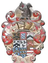 Bluett's father died in 1612, leaving him at the age of nine in the care of his grandfather Richard Bluett (d.1614), who died two years later. He then became heir to the family's 16 manors in Somerset, Devon and Dorset. As a tenant-in-chief he became a ward of the king, who sold his wardship to his great-uncle Arthur Chichester, 1st Baron Chichester (1563-1625), Lord Deputy of Ireland.[13] On 16 April 1619 aged 15, he matriculated at Wadham College, Oxford, founded (posthumously) only nine years before in 1610 by his distant cousin Nicholas Wadham (died 1609) of Merryfield, Somerset and Edge, Branscombe, Devon. Nicholas's ancestor Sir William Wadham (died 1452) had married the other Chiselden co-heiress, Margaret Chiseldon, whose sister Maude Chiseldon had brought Holcombe Rogus to the Bluetts.[14] He presented a gold flagon to Wadham College which was melted down for coin tempore Charles I.[15] In 1628 he was elected Member of Parliament for Tiverton, Devon.