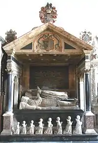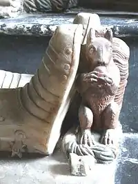 An elaborate marble monument to Sir John Bluett (d.1634) and his wife Elizabeth Portman (d.1636) exists in the Bluett Chapel, All Saints Church, Holcombe Rogus. Alabaster recumbent effigies of the couple are contained under a classical canopy. Sir John is dressed in full armour of Almain rivets and his head rests on a pillow with lace border in which is worked the Bluett crest of a squirrel eating a nut. The squirrel also appears as his footrest. A tablet above is inscribed thus: