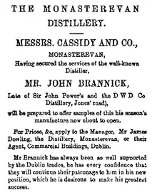 Towards the end of 1892, the Monasterevan Distillery advertised that they had "secured the service of the well-known Distiller, Mr. John Brannick, Late of Sir John Powers and the DWD Co Distillery, Jones' Road", asserting that Brannick "has always been so well supported by the Dublin trades, he has every confidence that they will continue their patronage to him in his new position, which he is desirous to make his greatest success".[13] According to Brannick's 1893 testimony as a witness in litigation against the Dublin Whiskey Distillery following the accidental death of an employee, he remained a shareholder in that company, and after serving as managing director of the Banagher establishment, was then a distiller at Cassidy's, Monasterevan, "where he had 100 men employed".[14] In January 1895, it was reported at the Ballickmoyler Petty Sessions for the 11th of that month that that Brannick was "appointed sole general manager as well as distiller" of Monasterevan Distillery, taking the place of the recently deceased James Dowling.[15]