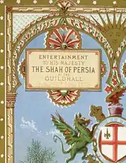 John Browning installed the first electric light in London, the occasion being a banquet to honour the Shah of Persia during his visit to Queen Victoria.[7] The location was the Guildhall, which has been used as a town hall in the City of London for hundreds of years and continues to be the home of the City of London Corporation.[14] One light, run with Bunsen cells, was positioned outside each window, due to the fumes. The operating cost of each light was £3 per hour.[7] Naser al-Din Shah Qajar was the Shah of Persia during the second half of the nineteenth century. During his reign, he toured Europe three times, in 1873, 1878, and 1889.[15] It was during the 1873 trip that the mayor and the Corporation of the City of London gave a banquet in the Shah's honour. Prime Minister William Ewart Gladstone arranged for the queen to entertain the Shah during the 1873 visit.[15] Queen Victoria did not attend the banquet of 20 June 1873, which was primarily a business occasion. The elaborate preparations for the banquet included not only the costly lighting scheme, but also a gilded, illustrated menu (pictured).[15]