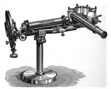 An astronomer, Browning was also Optical and Physical Instrument Maker to Her Majesty's Government. As such, he supplied telescopes to the Royal Observatory in Greenwich.[19] Browning also attached spectroscopes to telescopic equipment, garnering the attention of astronomical physicists J. Norman Lockyer and William Huggins.[10] He was elected to the Royal Astronomical Society in 1865. Browning was a pioneer in the manufacture of reflecting telescopes and bringing them to the attention of astronomers.[7] As the popularity of astronomy grew during the 19th century, his business in telescopes flourished.[19] An advocate of the Newtonian reflector, he was the author of A Plea for Reflectors, Being a Description of the New Astronomical Telescopes With Silvered-glass Specula, first published in 1867.[6][9] By 1876, the book was in its sixth printing.[9][20][21] Browning wrote many articles for the Monthly Notices of the Royal Astronomical Society, including a series on Jupiter's equatorial belt about 1870.[7] Browning was a perfectionist, a trait that in at least one instance had unfortunate consequences. When he delayed in providing Lockyer with a spectroscope until it performed to his high standards, Lockyer missed the opportunity of being the first astronomer to observe a prominence on the uneclipsed sun. While the delay was only partially responsible for Lockyer's missed opportunity, there is evidence that Browning long regretted his reluctance to part with the spectroscope in question.[7] Browning made a number of instruments for Lockyer, among them an 8-inch reflecting telescope that was delivered to Lockyer in 1871 and now greets visitors near the main door of the Norman Lockyer Observatory in Sidmouth, Devon.[22] Toward the late 1860s, in his quest to produce telescopes for a growing market, Browning collaborated with George Henry With (1827–1904), former schoolmaster at the Blue Coat School in Hereford. With was talented at producing high quality, large reflecting mirrors.[9][22]