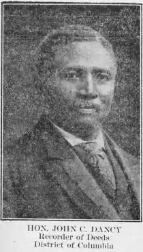 With the support of Booker T. Washington, he was appointed collector of customs at Wilmington, North Carolina in 1897, serving the position under presidents Harrison and McKinley.[4] That year, he was also involved in the founding of Coleman Manufacturing Company, the first cotton mill in the United States owned and operated by African Americans[5] In 1898, Dancy was a part of the founding of the National Afro-American Council, formed after the collapse of the National Afro-American League. T. Thomas Fortune was initially elected president, but he declined the position and Alexander Walters was selected. Dancy was elected Vice-President, Ida B. Wells secretary, and John W. Thompson treasurer. Washington was also a primary player in the group.[6] Tensions rose in Wilmington during this period, and Dancy's position on an organization in opposition to legislation which prevented interracial marriages increased the tension. Tension came to a head in August with the Wilmington massacre of 1898, during which thousands of the city's African Americans were attacked, and Dancy was forced to flee the city.[7] Dancy then was appointed to the position of recorder of deeds from 1901 to 1910.[4] His home in Washington became a center of Southern black society in the nation's capital.[8]
