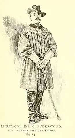 After graduation, although his father was a Unionist, John Underwood enlisted in Breckenridge's Division, Engineer Corps of the Confederate States Army, and served in Virginia and Tennessee. His uncle John Threlkeld Cox (1820-1886) was also a civil engineer and led several different Confederate cavalry brigades, mostly of Kentucky volunteers.[5] Young John Underwood soon contracted typhoid fever, and was captured in 1863 at Tullahoma, Tennessee. Imprisoned in Cincinnati and Boston, he received a parol from President Abraham Lincoln.[6]