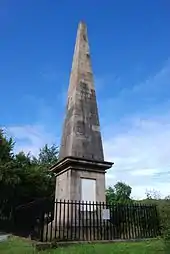 During the Waterloo Campaign, Cameron's 92nd Foot alongside the 42nd Highlanders, 1st Royals, and 44th East Essex, formed General Pack's 9th Brigade of Sir Thomas Picton's 5th Division, and were among the first troops to march out of Brussels at daybreak on 16 June 1815. On that day, when leading his regiment in an attack on an enemy stronghold, on the road to Charleroi near the village of Quatre-Bras, Cameron was mortally wounded. He died the following morning and was buried there at the side of the road to Ghent road, during the great storm of the 17th by his foster-brother and faithful attendant, Private Ewen McMillan, (who had followed his fortunes from the first day he joined the Army), James Gordon, Regimental-Paymaster and a close personal friend, and a few soldiers of the regiment whose wounds prevented them engaging in combat on that day.[1] At the request of his family, Cameron's remains were disinterred soon afterwards, brought home in a man-of-war and, in the presence of a gathering of three thousand highlanders from the then still populous district of Lochaber, were laid to rest in Kilmallie churchyard where an obelisk inscribed with a quotation by Sir Walter Scott marks the site of his grave.[7][lower-alpha 2]