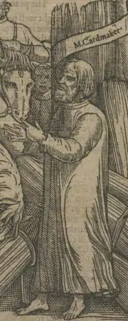 When the persecution broke out under Mary, Cardmaker and his bishop, William Barlow of Bath and Walls, came to London disguised as merchants, and vainly attempted to escape over sea, November 1554.[4] They were cast into the Fleet Prison, where they lay till January, when the chancellor Gardiner, and others in commission, began to have the accumulated prisoners for religion, who amounted to about eighty, brought before them at St. Mary's Overy. Barlow submitted and escaped. Cardmaker, who was examined on the same day (28 January) as John Hooper and Edward Crome, was understood also to have recanted,[5][6] and was remanded to the Compter in Bread Street, with the prospect of speedy deliverance. But his compliances were only, as he himself said, ‘by a policy'.[7] He was reanimated, it was thought, in his new prison by the zeal of Laurence Saunders, his fellow-captive, and a second inquiry was made into his opinions. He was brought before Bonner on 26 May 1555, examined in several articles, cast for heresy, and committed to Newgate Prison, whence he was carried to Smithfield on 30 May and burnt alive in the company of one Warne, an upholsterer.[8]