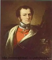![]() A colour picture of an 1830s painting of the fourth Earl of Tyrconnell, in the scarlet uniform of the North York Corps of Yeomanry with a hunt green cap and helmet. Around his neck is a high leather neck guard. | |
