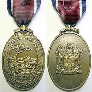 The John Chard Medal is a military long service medal which was instituted by the Union of South Africa on 6 April 1952. Until 1986, it was awarded to members of the Citizen Force of the South African Defence Force for twelve years of efficient service and good conduct. The period of qualifying service was reduced to ten years in 1986.[1][2]