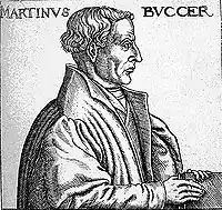 Archbishop Cranmer reputedly told Cheke that he might be glad all the days of his life to have such a scholar as the Prince, "for he hathe more divinitie in his litle fynger, then all we have in al our bodies."[62] Cheke meanwhile prepared a Latin version of the first Book of Common Prayer, the form in which Peter Martyr read it when consulted over its review by Cranmer. Peter Martyr doubted if the bishops would approve it, but Cheke foreknew the King's determination to implement it. In October 1550 his friend Martin Bucer, Cambridge Regius Professor of Divinity (who was indebted to Cheke for some favour offered by the King towards his countryman Johann Sleidan), presented him with the draft manuscript of his De Regno Christi (which remained unpublished until 1557).[63][64]