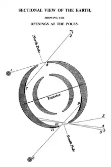 Writing in August 1817 to his stepson, Anthony Lockwood, Symmes for the first time stated that "I infer that all planets and globes are hollow".[22] But Symmes' theory was far from unprecedented. While the idea of polar openings leading into a Hollow Earth was Symmes's innovation, the concept of a Hollow Earth had an intellectual pedigree dating back to the 17th century and Edmond Halley.[23] Halley proposed his Hollow Earth theory as an explanation for the different locations of the geographic and magnetic poles of the Earth. While Halley's contemporaries found the geomagnetic data he had gathered to be of interest, his proposal of a Hollow Earth was never widely accepted. The theory remained dear to Halley; he chose to have his final portrait (as Astronomer Royal) painted depicting him holding a drawing of the Earth's interior as a set of concentric spheres.[16] Some scholars have proposed that Symmes may have learned of Halley's Hollow Earth via Cotton Mather's book, The Christian Philosopher, a popular survey of science as natural theology.[13][24]