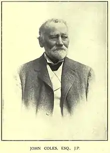 John Coles (1833–1919) was a member of the London Stock Exchange, a prominent Actuary, a Justice of the Peace for the City of London and a freeman of the borough of Tiverton, Devon.