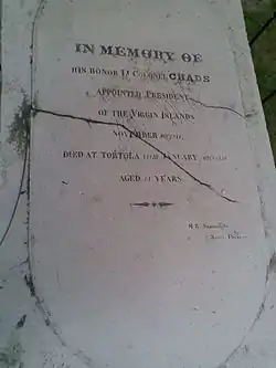 Lieutenant-colonel John Cornell Chads (9 August 1793 – 28 February 1854) joined the Royal Marines and reached the rank of 2nd lieutenant on 4 May 1809, aged 16. He became a captain in the 1st West India Regiment on 27 January 1820. He became a major on 22 April 1836, still serving in the West India Regiment. He was promoted to the rank of lieutenant colonel on 3 March 1843 and then retired on full pay aged 50. He returned to England with his family and lived in Portsea, Hampshire, until his appointment as President of the British Virgin Islands in 1852. He died in Government House, Tortola, on 28 February 1854 with the rank of colonel.