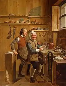 According to the Royal Collection Trust, the German painter Johan Zoffany was commissioned by King George III, a purchaser of Cuff's microscopes, to depict him.[1] However, doubts have been expressed whether the painting titled John Cuff actually is a portrayal of him, and it has also been known as The Lapidaries or Two Old Men.[2]