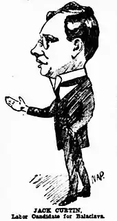 He wrote for radical and socialist newspapers.[22] From 1911 until 1915, Curtin was employed as state secretary of the Timberworkers' Union. He was elected federal president of the union in 1914. During World War I he was a militant anti-conscriptionist; he was briefly imprisoned in December 1916 for refusing to attend a compulsory medical examination,[23] even though he knew he would fail the exam due to his very poor eyesight.[24] He also stood (unsuccessfully) as the Labor candidate for Balaclava in the 1914 federal election.[25][26] The strain of this period led him to drink heavily and regularly, a vice which blighted his career for many years.[27] He proposed to Elsie Needham, the sister of Labor Senator Ted Needham, on St Kilda Beach,[24] and they were married on 21 April 1917 in the dining room of a private home in West Leederville.[28][29]