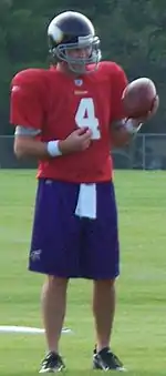 Booty broke from convention and stated on a national television broadcast, more than a week before the NFL draft, that he hoped to be selected by the Minnesota Vikings.[24] He was drafted by the Vikings in the fifth round (137th overall) of the 2008 NFL Draft. Booty made the team after a pre-season battle for the third spot on the depth chart with Brooks Bollinger. He did not take a snap in 2008, but after starter Gus Frerotte went down with a lower back injury, Booty was listed as the second-string quarterback during the week 15 meeting with the Arizona Cardinals and Tarvaris Jackson made the start.