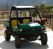 The John Deere Gator is a family of small all-terrain utility vehicles produced by the John Deere Corporation. Gators typically feature a box bed, similar in function to a pickup truck. The bed can also be installed as an electric dump body. The John Deere Gator has been made in a variety of configurations, with either four, five or six wheels.[1] The Gator line of vehicles are designed to serve on farms, worksites, and ranches, rather than as a pure off-road vehicle. However, it is possible to order with specific off-road features. Introduced in 1992, the vehicle replaced the five-wheeled John Deere AMT line introduced in 1987.[2]