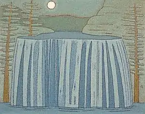 By 2006, Dilg committed fully to a spare landscape motif that engages its subject less in the historical sense than as a trope to metaphorically record and convey his relationship with the land.[17][7] This work brings together diverse sources and precedents in a singular, personal vision: 19th-century chromolithography, Japanese woodcuts and Early Renaissance landscapes, folk or self-taught art, vintage postcards and game boards, thrift store paint-by-number waterfall paintings, handmade signs.[1][7][29][3] His interest in tourist, souvenir and folk-art sources stems from his desire to recover the immediacy, sense of wonder and discovery, and uncanniness of such imagery—qualities that are often trained out of professional artists.[6][30]