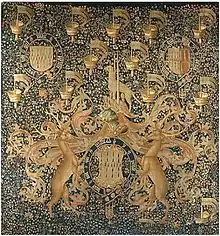 A large wool and silk Flemish tapestry dated post-1487 exists in the Cloisters Collection of the Metropolitan Museum of Art in New York which consists almost entirely of the armorial bearings and heraldic badges of Lord Dynham.[24][25] It is said to come from the workshop of the Grenier family of Tournai, which is known to have supplied tapestries to King Henry VII in 1486 and 1488. In the latter year the king ordered his then Treasurer, Lord Dynham, to allow these imports to enter England free of duty, and according to Bonnie (1962) Dinham may have ordered one for himself at the same time[26]