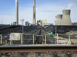 The plant is located between West Virginia Route 817 (Winfield Road) and the Kanawha River. Coal is delivered to the facility by barge or rail, after which it is stored in the plant's coal yard. The coal yard storage capacity can reach up to 1.75 million tons of coal, while the entire plant consumes an average of 26,000 tons of coal daily at full capacity.[4] The coal is then transported via conveyor belt from the coal yard into the plant, where it is pulverized into a fine, talcum powder-like consistency. Primary fans then blow the ground up coal into boilers where it burns at 1,000 °F (538 °C) to turn water into steam. That steam gets sent into turbines, where it turns blades. These blades act like a windmill and drive a generator that produces electricity at 26,000 volts. Transformers outside the plant step up the voltage to 345,000 volts and 765,000 volts.[4]