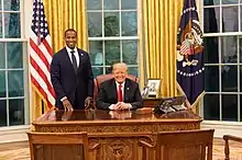 James supported Ted Cruz in the 2016 Republican Party presidential primaries.[41] He later became a Donald Trump supporter,[41] and tweeted in 2018 that, if elected to the Senate, he would back Trump "2,000%."[45][46] During his 2020 campaign, James accepted Trump's endorsement and campaigned alongside him.[47][48] James has not been publicly critical of Trump or his actions, such as using force to clear peaceful protestors for a photo op.[43] During a meeting with Black faith leaders, James was asked whether he disagreed with Trump on anything. James said, "Everything from cutting Great Lakes funding to 'shithole countries' to speaking ill of the dead. I mean, where do you want to start?"[49] In a leaked audio recording of a meeting with African American leaders in Michigan, James was asked why he hadn't publicly criticized Trump. He said he thought it was better to be silent in public in order to gain access to Trump. James said, "Donald Trump doesn't need less Black folks around him, he needs more," and that his goal was "achieving equity and equality for our people, not standing up on Twitter and condemning folks."[50] During the campaign, Democrats sought to tie James to Trump, while James has said his candidacy was not a referendum on the president.[39]