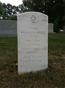 Major General John Francis Regis "Jeff" Seitz (May 22, 1908 – October 10, 1978) was a career United States Army officer who, after serving in World War II and the Korean War, retired as Deputy Commander of the First United States Army in 1966. Seitz graduated from the United States Military Academy at West Point, New York, in 1929. He served in several assignments before commanding a battalion at Schofield Barracks at Oahu, Hawaii on December 7, 1941, during the Japanese attack on Pearl Harbor. After the United States entered the Second World War, Seitz served in important staff positions from early 1942 to late 1943. He was highly decorated for his service as colonel commanding the 26th United States Infantry Regiment in combat in the European Theater of World War II for most of the remainder of the war, which was especially distinguished.