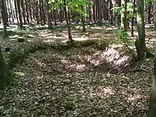 The Hürtgen Forest was dense with trees on many steep ridges falling off into narrow valleys. The dense woods and soggy ground made tank support of the infantry difficult and in some places impossible. The Germans placed log-covered bunkers, minefields and barbed wire throughout the forest. They could use the few good roads for supply while the Americans had to cross muddy, unpaved ground, made worse by rain in early November.[113] CT 16 and CT 26 were assigned to capture the high ground on either side of Wehe Creek in order to secure a road through the valley.[114] CT 26's first objective was the capture of four hills around a castle named Laufenburg about halfway from Schevenhütte to Langerwehe on the eastern edge of the forest.[114]