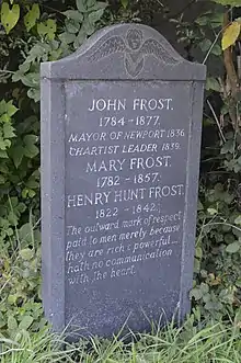 Frost was buried in the churchyard of the Church of the Holy Trinity with St Edmund, Horfield, Bristol in accordance with his will.[13] In the 1980s Richard Frame found Frost's lost grave site and organised for a new headstone to be created and erected on the site, with the aid of a grant from Newport council. The new headstone was unveiled by Labour Party leader Neil Kinnock.[14][15]