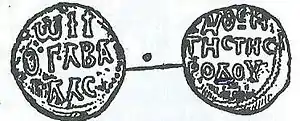 The Gabalas brothers issued their own copper coinage, of unknown value or denomination. They were aniconic, and contained only inscriptions, John's coins bearing his name and title: +ΙW[ΑΝΝΗC] Ο ΓΑΒΑΛΑC ("John Gabalas") on the obverse, and Ο ΑVΘΕΝΤΗC ΤΗC ΡΟΔΟV ("The Master of Rhodes") on the reverse.[6] As Alexis Savvides points out, the omission of the formula Ο ΔΟVΛΟC ΤΟV ΒΑCΙΛΕ[ΩC] ("Servant of the Emperor"), that appeared on the coins of Leo, is remarkable, for in reality John's position vis-a-vis the Nicaean emperor was far more subordinate than that of his brother.[7]