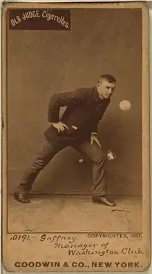 He joined the National League's umpiring staff in August 1884, with his first game being an 11-inning, 1–0 game between the two teams battling for first place, Providence and Boston. He quickly gained wide respect as a top officiator, and as the league's best judge of balls and strikes. In the middle of his third season, his knowledge of the game was so highly regarded that he was offered the managing position of the Washington Nationals, and he took over the team on August 21, 1886. The team, mired in last place, finished the last third of the season without improving its position; but Gaffney continued in the post for the entire 1887 campaign, with a slight improvement to 7th place. He finished his managing career with 61 wins against 101 losses. He was much-liked by the players, and while he was traveling during the 1887 world championship series, his players – including catcher Connie Mack and future umpiring great Hank O'Day – boarded his train during a Washington stopover and surprised him with the gift of a diamond ring in appreciation of his efforts.