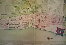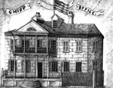 Fish and Gordon were frustrated in their joint land speculations, as their claims were disallowed by British officials.[34] Gordon, then a merchant and slave trader[35] from Charles Town, had formed a partnership with Fish[33] operating as his agent.[36] The two speculators purchased largely from the outgoing Spaniards, but the British authorities refused to allow the deeds to be recorded. These officials disregarded entirely the conveyances of the Catholic church properties, and proceeded to take possession of them in defiance of the provisions of the treaty of 1763. Because the Spanish monarchy had proprietorship rights in the patronato real relationship of church and state,[37] those same prerogatives were claimed in the name of the English monarch, who had assumed sovereignty in Florida. All tierras realengas (royal lands) in St. Augustine, including the church estates, thus reverted to the British Crown. The Catholic Church and the two partners were subsequently required to turn over the buildings and all the land in their transaction to the British government. On orders from England, the Spanish bishop's house was seized for use of the Church of England, and the Convent of St. Francis, which had the best well in the town, was taken to house British troops, extensive barracks being erected on the old foundations.[38]