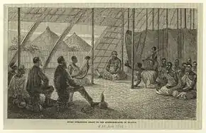 Local Church Missionary Society records indicate that Speke fathered a daughter whilst staying at the court of Muteesa I the Kabaka (or King) of Buganda. Whilst staying at the court Speke was given two girls aged about 12 and 18 from the entourage of the Queen Mother. Speke appears to have had sexual relations with both of them, before handing over the youngest (whom he named 'Kahala') to another man.[11] Speke fell in love with the elder girl, 'Meri', according to his diaries (which were redacted when they were published as books later).[6] While Meri proved loyal to Speke and fulfilled her task at being a "wife" to him as commanded by the Queen Mother, Speke was distressed because he thought she had no love or deep attachment to him. He "divorced her on the spot" in April 1862 after she defied his orders regarding the sacrifice of a goat.[11] Whilst Meri visited Speke several times after this incident, the couple did not reconcile. Speke claimed to have tried to arrange a better relationship for Meri with another man, without success it seems.[6]