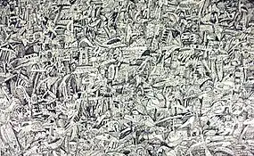 John Himmelfarb (born 1946) is an American artist, known for idiosyncratic, yet modernist-based work across many media.[1] Diverse influences ranging from Miró, Matisse and Picasso to Dubuffet, New York school artists like de Kooning, Guston, and Pop artists inform his work, described by critics and curators as chaotically complex and tightly constructed.[2][3][4] He often employs energetic, gestural line, dense patterns of accumulated shapes, and fluid movement between figuration and abstraction, using strategies of concealment and revelation to create a sense of meaning that is both playful and elusive.[5][6][7] His work is also unified by "a circulating library" of motifs and organizing structures, such as geographic and urban mapping, abstracted natural and industrial forms, and language systems.[8][9] Assessing him at mid-career, New Art Examiner’s Andy Argy wrote "Himmelfarb’s art is original […] His unabashed immersion in graphic art, emphasizing drawing over painting, has earned him an important place among artists who make drawings into major aesthetic statements."[10] Himmelfarb next turned to monumental paintings that critic Christopher Moore called joyful, luminous, and frenetic pyrotechnical displays.[11] In 2006, he began to devote considerable studio time to sculpture that curator Gregg Hertzlieb described as an expression of the "human need for play and (our) enduring fascination with metamorphosis and transformation."[12]