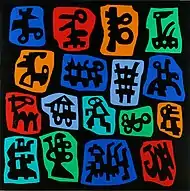 Himmelfarb's fascination with language dates to his early Harvard days—when he invented his own pictorial alphabet—and sporadically resurfaced in drawings like 5/30/79 and his "Grid" works of the 1970s.[31][18] In the 1990s, he began two series representing his deepest exploration of language, his remarkably varied "Icons" and "Puzzles."[32] In these works, he created compositions resembling sacred scrolls, tablets, fragments of temple facades and everyday documents, fashioned from private, invented languages of pictograms, hieroglyphs and characters derived from Neolithic and religious symbols, ancient earth drawings, Asian and Arabic alphabets, and seal scripts that imply coherent statements, yet remain mysterious.[27][28][9] Formally, the series relate back to Himmelfarb's early drawings in the tension between overall image and pattern, manipulation of positive and negative space, and exploration of visual structures—here, of language rather than social order.[27][33] In "Icons" like Motor Home (2007) or the ceramic-tiled Coast of Chicago (2004)—a public commission for the Chicago Transit Authority's Kedzie Avenue subway stop[34]—Himmelfarb worked in a simplified, graphic manner; in "Puzzle" works such as Jump, he accumulated more drawn detail in the fragments. Critic John Brunetti described them as "evocative gestalts of language, image, and thought," combining "unusual beauty" and "rigorous discipline," to suggest the physical and spiritual signatures left by past civilizations or the richness of life.[29]