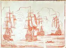 John Houlton Marshall was the son of Elias Marshall, master shipwright, of H.M. Careening Yard, Halifax.[1][2] He entered the Royal Navy in 1778. He was promoted to lieutenant on 30 June 1794 and by 1799 was serving as first lieutenant of the 38-gun frigate HMS Naiad. As such he fought at the Action of 16 October 1799 where Naiad and three other British frigates captured two Spanish frigates which were transporting large amounts of treasure. Marshall was still serving in Naiad on 17 May 1801 when he commanded a cutting out expedition at Pontevedra which captured the Spanish packet l'Alcudia and destroyed her consort El Raposo.[3] On 13 July 1804 he joined the 100-gun ship of the line HMS Britannia, and he fought on board her at the Battle of Trafalgar on 21 October 1805. His share of the prize money was 65 pounds 11s 5d plus a Parliamentary Award of 161 pounds.