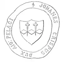John IV Crispo was the son of Francesco III Crispo; his mother was Taddea Caterina Loredan, sister of Antonio Loredan. His father was reportedly insane, and in 1511, he murdered his mother in a fit of insanity.[1] The murder caused a rebellion among the Naxians who deposed Francesco in favor of his eleven year old son.[1] When told of the rebellion, his father reportedly attacked his son with a knife, and John IV was forced to flee from a balcony to escape his father.[1] The Naxians asked the Republic of Venice for support against Francesco III, and the Venetians had Francesco seized and deported in captivity to Venetian Crete, while John IV was placed under the guardianship of his maternal uncle Antonio Loredan, who ruled the Duchy as Venetian governor during the minority of John IV.[1]