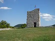 Simultaneously, he also made plundering raids and invasions from his territory of Upper Slavonia. He acquired the fort of Ludbreg from the Péc kindred in Bjelovar-Križevci County and Béla Castle from the Priory of Vrana (Order of Saint John) and Lobor in Varaždin County.[6] Around 1314, John also besieged and occupied Alsólendva in southern Zala County (today Lendava, Slovenia) from Stephen Hahót or his son Nicholas (formerly historians János Karácsonyi and Erik Fügedi incorrectly identified Ivan Kőszegi as belligerent and set 1292 for the date of the siege).[10] Egyed Monoszló made his last will and testament in March 1313, not long before his death; according to his intention, his widow and minor orphan daughters were supposed to inherit the whole Atyina lordship (today Voćin in Croatia). However, as Charles I narrated in his document issued on 22 May 1317, John Kőszegi demanded Atyina for his family in accordance with the right of escheatage. Nevertheless, Egyed's son-in-law Nicholas Aba and his brothers acquired Atyina Castle. John Kőszegi captured and imprisoned Nicholas and Peter Aba (or Atyinai) shortly thereafter. In the first half of 1314, Nicholas was taken tied up before the Atyina Castle and dragged along the walls at the heels of a horse to persuade the defenders to surrender the fort. Despite this, John Kőszegi was unable to capture Atyina and took Nicholas back to prison, who languished in captivity in the subsequent three years.[11] Sometimes before 1316, John also occupied the fort of Korođ (Kórógy) in Valkó County from its owners, the Kórógyi family.[12]