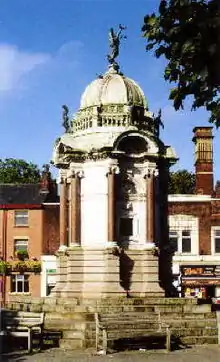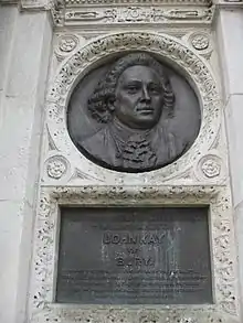 In Bury, Kay has become a local hero: there are still several pubs named after him, as are the Kay Gardens.[50] Bury town centre has William Venn Gough's 1908 Memorial to John Kay (sculpture by John Cassidy).[51] Planning began after a 1903 Bury public meeting launched a public subscription. 19th century efforts to acknowledge Kay achieved little, but by 1903 it was felt that Bury "owed John Kay's memory an atonement", and that all Bury should contribute in restitution to "that wonderfully ingenious and martyred man".[52]