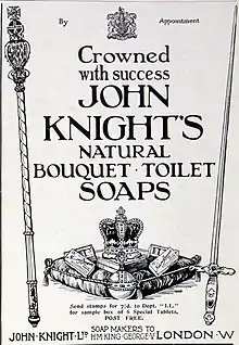 In 1817, John Knight Soap Works was officially established in the industrial area of Wapping, East London. The company was renamed John Knight & Sons when five sons joined the business in the 1840s. For decades, Knight provided candles and washing soaps to the royal family in London. In recognition, John Knight & Sons were awarded a Royal Warrant that officially branded the company as Soap Makers to King Edward VII, in 1903. It was also during this year that the name of Primrose Soap was changed to The Royal Primrose Soap. In 1906, the soap and candle company went public as John Knight, Ltd.[5]